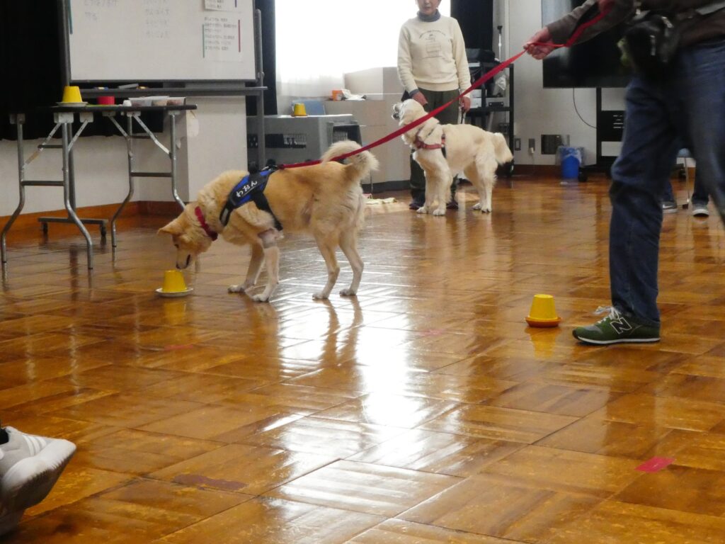 散歩の後は、2頭のノーズワークのデモンストレーションを見てもらいました。2頭共に普段から訓練を積み重ねており、ごほうびの入ったカップを見事に探し出しました。