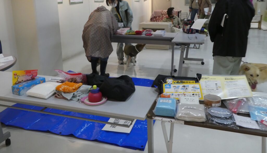 次に、自分が準備している避難用品とセンター展示室の避難用品、犬用避難バッグの中身を確認しながら、推奨リストとの比較を行ってもらいました。