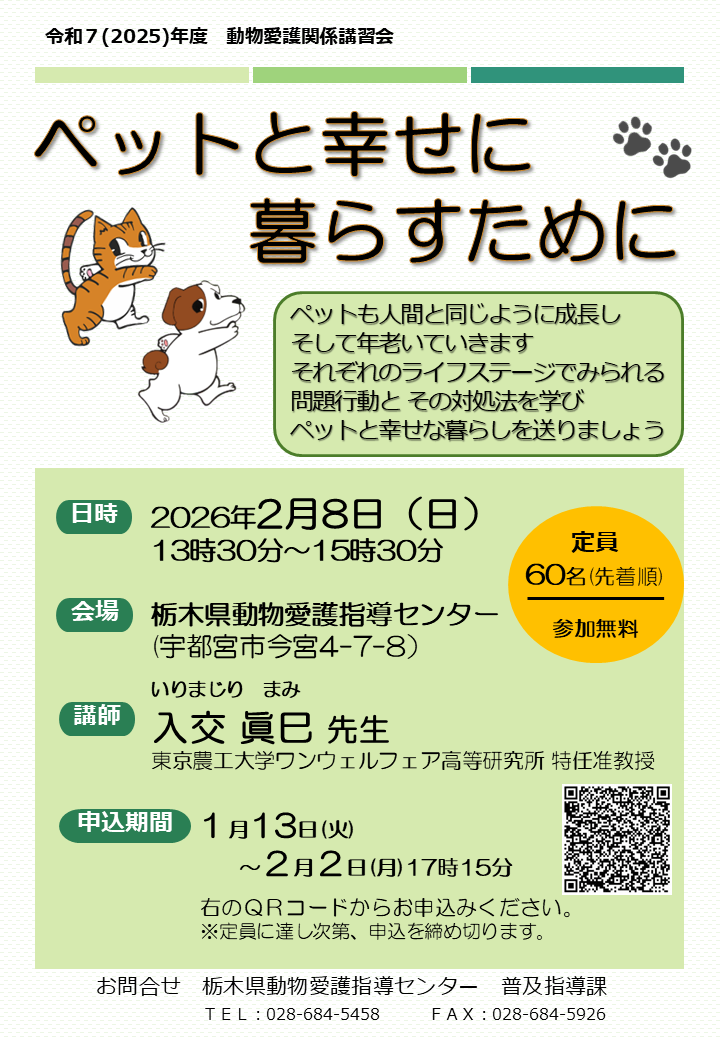 栃木県動物愛護指導センターでは、県民の皆様を対象に「動物愛護関係講習会」を開催しています。